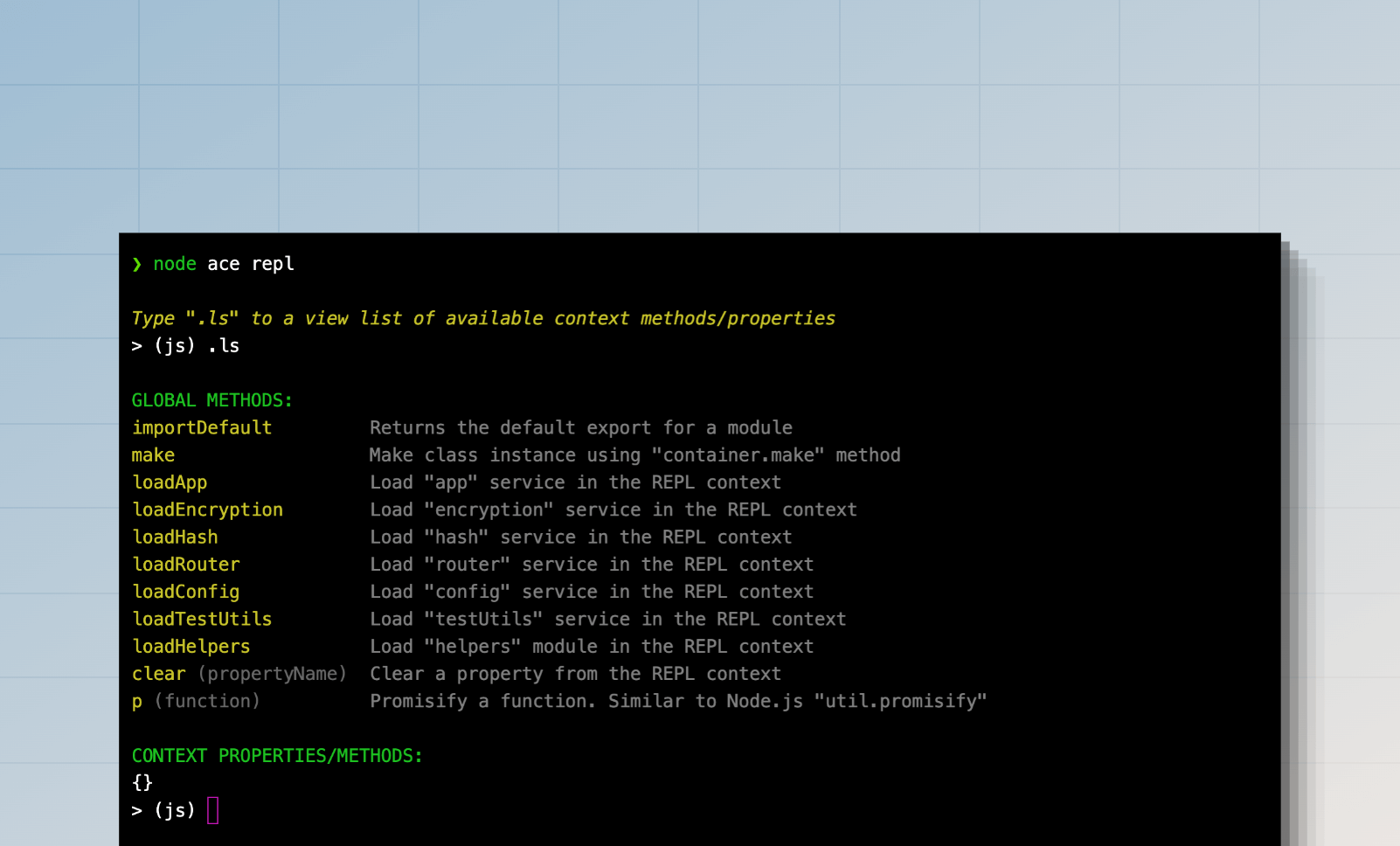 与 Node.js REPL 一样,AdonisJS 提供了一个应用程序感知的 REPL,可从命令行与应用程序交互。您可以使用 node ace repl 命令启动 REPL 会话。