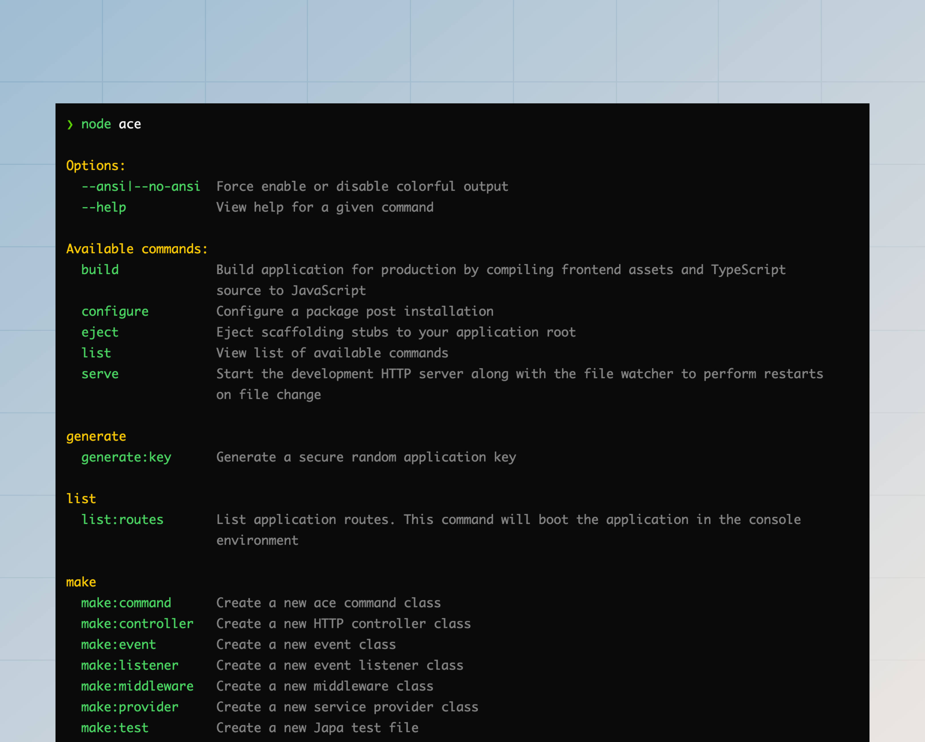在本指南中,我们介绍框架核心和官方包附带的所有命令的用法。您也可以使用 node ace list 命令或 node ace <command-name> --help 命令查看命令帮助。